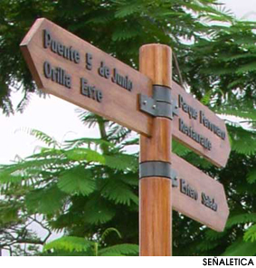 La señalética es de madera y acero pintado. Una vez instalada, se giran las flechas hasta la posición deseada.