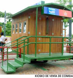 Se diseñaron cuatro kioskos de venta de comida, inspirados en el vagón de un ferrocarril, diseño coherente con el concepto del Parque de la Ferroviaria, antigua estación de tren. |