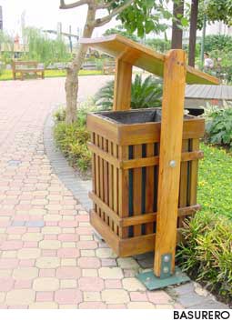 La madera tratada en autoclave es el material predominante del mobiliario de los Jardines. El basurero es pivotante. En su interior tiene un tacho de fibra de vidrio.