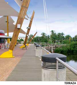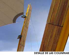 Los bolardos son de hormigón visto, acero inoxidable y acero pintado. El pasamanos es de acero inoxidable. Las columnas de acero pintado y madera, con pivotes en la parte inferior para tensar la membrana. |