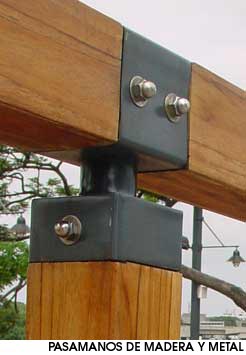 Las vigas de madera del pasamanos son ancladas con piezas de acero a ras de la madera, se utilizan pernos y tuercas con capucha de acero inoxidable.