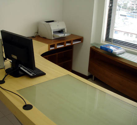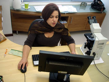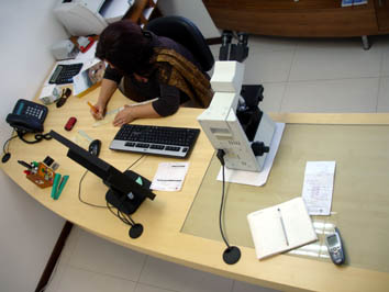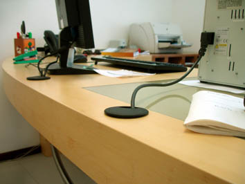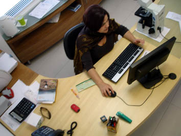| Escritorio para dos puestos de trabajo: una computadora y un microscopio.