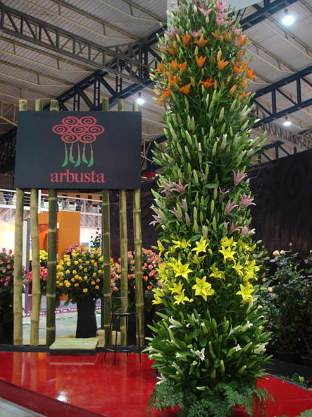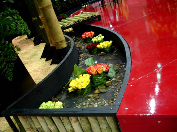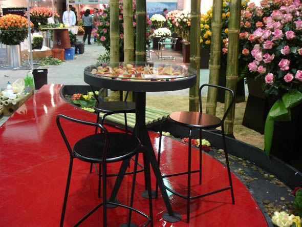 En su elaboración se utilizó bambú, acero galvanizado madera lacada. :a mesa es de acero lacado con vidrio, a través del cual se ven pétalos de rosa